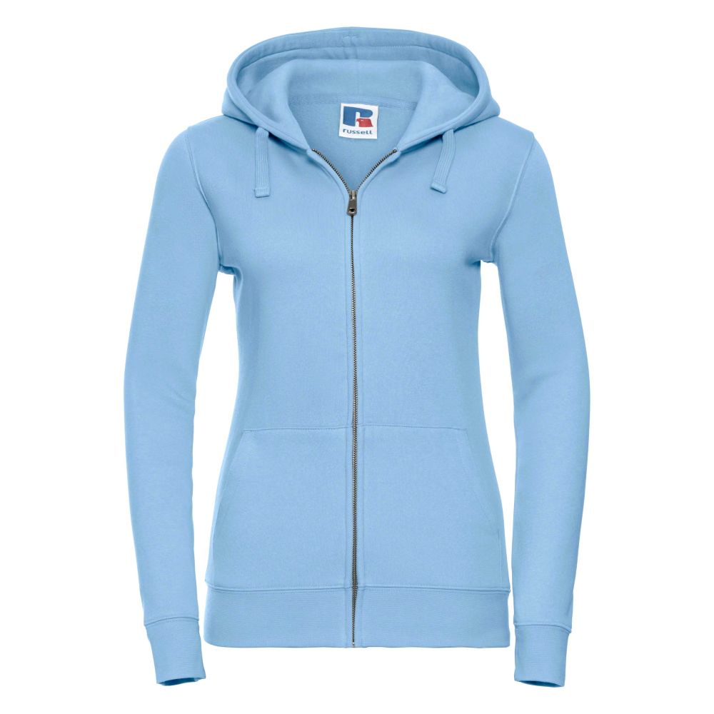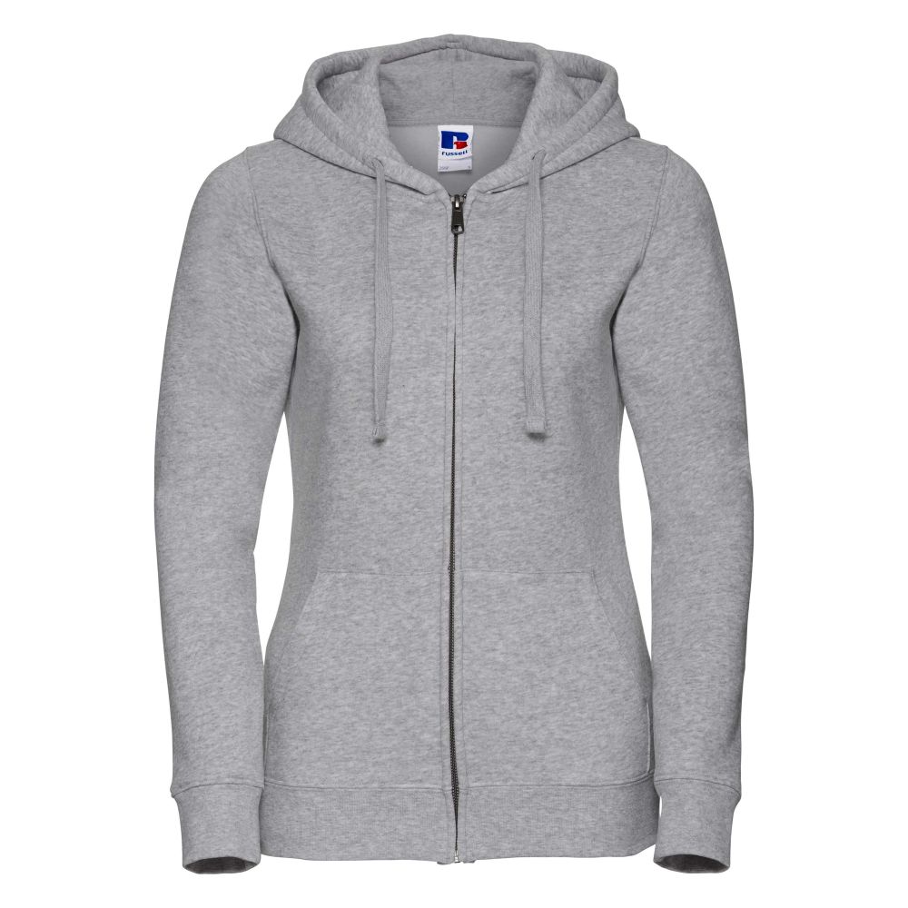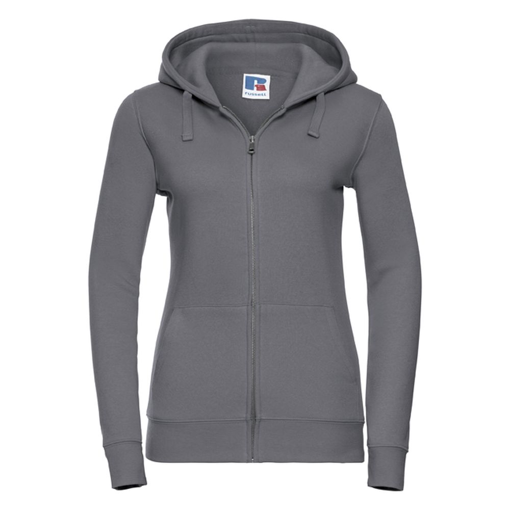 80 % gekämmte ringgesponnene Baumwolle, 20 % Polyester, Außenmaterial 100 % Baumwolle (3-lagiger Sweatshirt-Stoff), zeitgemäß feminine Passform, schlankere Schulterpartie und Ärmel, nach vorn versetzte Schulternaht, Nackenband in Fischgrätoptik für Stabilität und besonderen Tragekomfort, Saum und Bündchen weiter geschnitten und mit Elasthan, Decknähte an Armausschnitten, Bündchen und Saum, modisch flaches Zugband mit Knopflochösen, gefütterte Kapuze mit Zugband-Führung, Kopfhörer-Kabelführung, verdeckter messingfarbener YKK-Reißverschluss, Kängurutasche