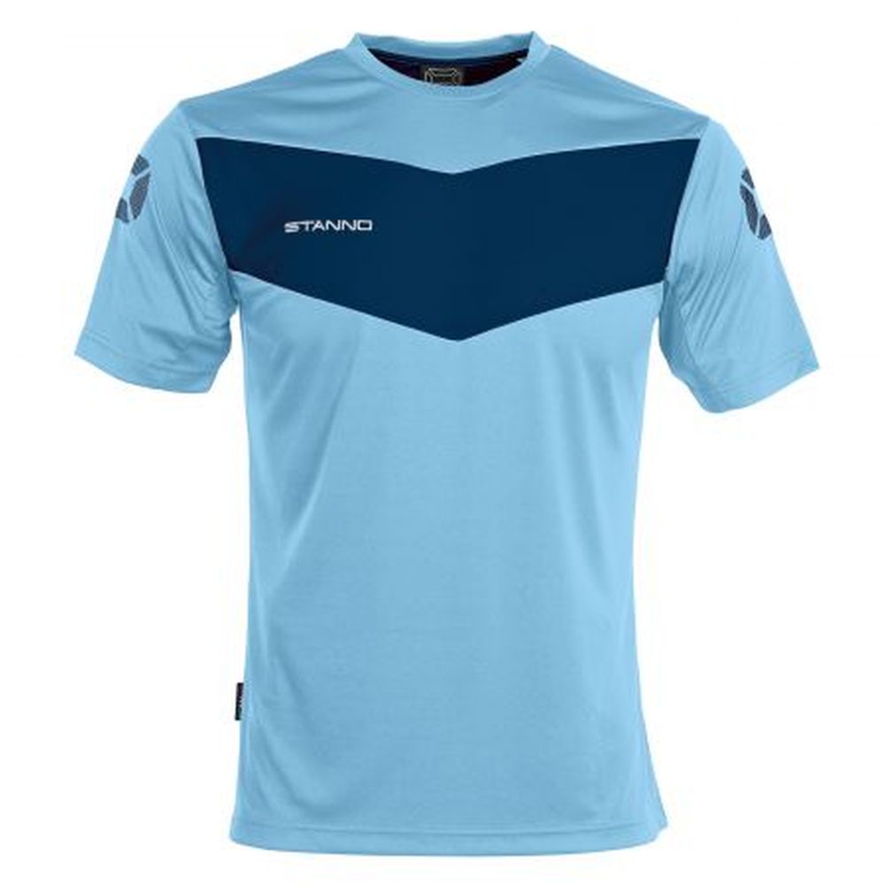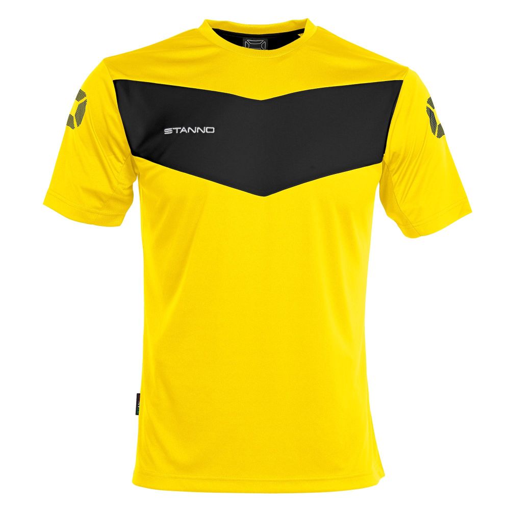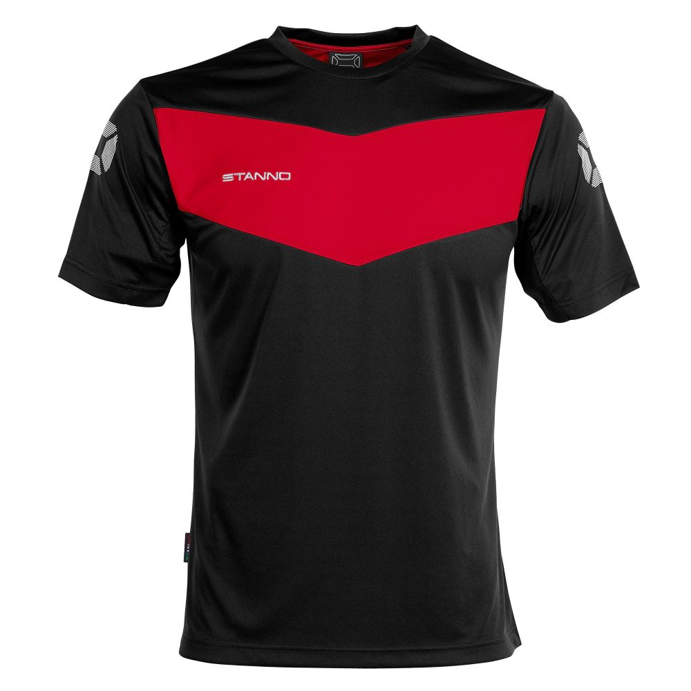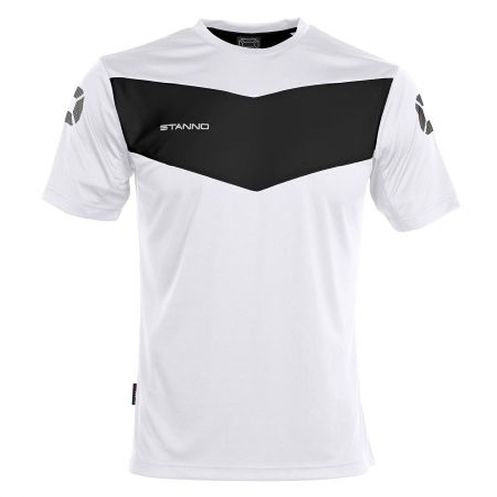 100 % Polyester ClimaTec, schnell trocknend, Mesh-Einsätze auf dem Rücken und unter den Armen, Rippstrick-Kragen, seitlich schmale Paspel in Kontrastfarbe, gestickter Stanno-Schriftzug und gedruckte Stanno Logos